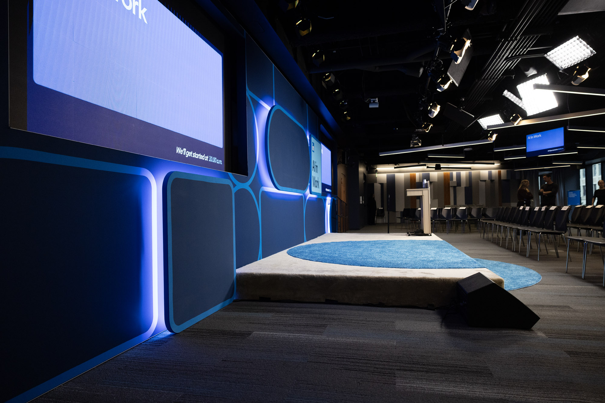 The centerpiece of the day: keynote from LinkedIn CEO Ryan Roslansky, fireside conversations, insights from industry leaders, and live walk-throughs of how AI is reshaping work. The stage was designed as a geometric, layered, visual anchor — transforming the space, introducing energy, and creating a camera-ready backdrop for livestream and press.